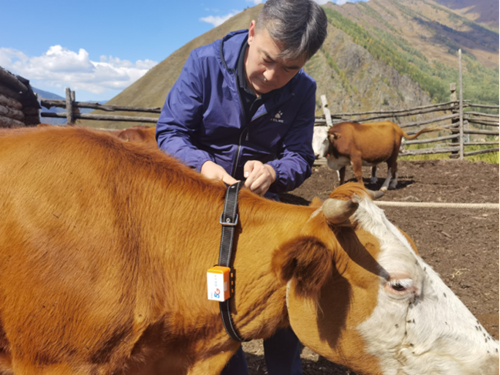 中國電信阿勒泰公司員工正在為養(yǎng)殖戶的牛戴上智慧畜牧大平臺配套的“5G智慧項圈”。
