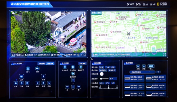 在5公里之外的平江路歷史街區(qū)倉街消防中隊,警報響起,消防演練定期進行。無人機從消防站無人機方艙快速飛出,視頻畫面實時傳送至監(jiān)控大屏,紅外線熱成像系統(tǒng)迅速鎖定火情點位,幫助消防員順利實施救援。