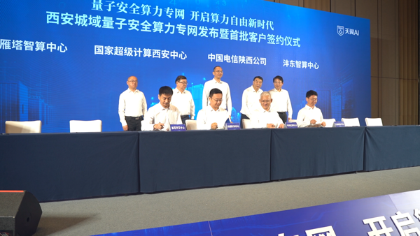 目前,中國電信陜西公司已經(jīng)完成首批客戶的10G量子算力網(wǎng)絡(luò)免費(fèi)接入,第一批接入客戶包括高校、園區(qū)、創(chuàng)新創(chuàng)業(yè)企業(yè)等,其中西安交通大學(xué)、西北工業(yè)大學(xué)、西安電子科技大學(xué)、西安理工大學(xué)、西安建筑科技大學(xué)、西安郵電大學(xué)、西安石油大學(xué)、西安工程大學(xué)8所高校用戶;西安高新區(qū)、西安環(huán)普科技產(chǎn)業(yè)園、西咸新區(qū)灃東新城科技園3家園區(qū)客戶;中科昇騰(西安)科技有限公司、軟通動力信息技術(shù)(集團(tuán))股份有限公司、深圳市優(yōu)必選科技股份有限公司、陜西四維數(shù)邦科技有限公司、西安潤和軟件信息技術(shù)有限公司、西安創(chuàng)始人眾創(chuàng)空間有限公司、西安西拓電氣股份有限公司、西安盈谷網(wǎng)絡(luò)科技有限公司8家創(chuàng)新、創(chuàng)業(yè)企業(yè)客戶已簽署協(xié)議,全面接入中國電信陜西公司西安城域量子安全算力專網(wǎng)。同時中國電信陜西公司已經(jīng)完成雁塔人工智能、灃東人工智能、國超西安節(jié)點(diǎn)和中國電信自有算力中心在內(nèi)的共計(jì)1100P的算力節(jié)點(diǎn)接入工作。