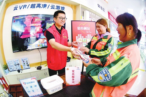 中國(guó)電信江蘇淮安分公司清江浦區(qū)營(yíng)業(yè)廳“愛心驛站”休息區(qū)向戶外工作者提供了千兆寬帶、高清電視、手機(jī)加油站、智能手機(jī)應(yīng)用輔導(dǎo)、手機(jī)美容等服務(wù)項(xiàng)目。7月10日,“愛心驛站”黨員志愿者為戶外環(huán)衛(wèi)工人送上清涼礦泉水。