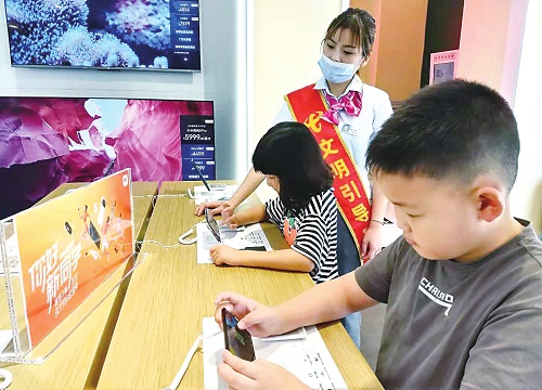 為了營造風清氣正的網(wǎng)絡(luò)環(huán)境,讓更多的孩子體驗文明上網(wǎng),近來,中國電信江蘇無錫分公司在市區(qū)設(shè)立新同學(xué)文明上網(wǎng)輔導(dǎo)臺,宣講先進的通信文化和反詐的要義、方法;指導(dǎo)孩子合理使用手機,通過智能手機上網(wǎng)課;提供夏令營文明行的活動場所。圖為7月21日上午,人民路營業(yè)廳的電信輔導(dǎo)員在引導(dǎo)孩子“上好網(wǎng)、好上網(wǎng)”。