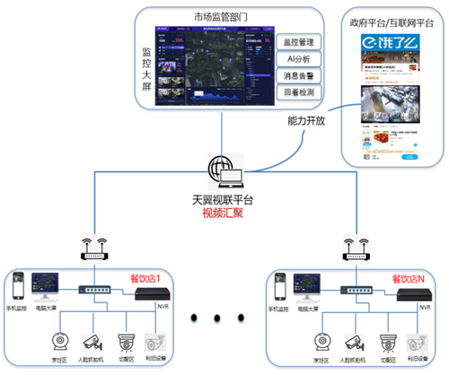 明廚亮灶數(shù)字化治理平臺通過不同點位的攝像頭、電信寬帶、天翼云眼視頻系統(tǒng)、集約AI能力,對店員、廚師的行為進行巡查,讓食品安全更加清晰可見。對于餐飲企業(yè)而言,不僅增強員工規(guī)范操作的責任意識,也提高了餐飲企業(yè)的管理效率,將食品生產(chǎn)過程充分展示給社會公眾,達到企業(yè)正面形象宣傳效果;對于廣大消費者而言,使消費者及時了解餐飲商戶后廚加工過程,監(jiān)督餐飲商戶食品加工規(guī)范化,讓消費者點得安心、吃得放心,同時公眾還可在線評價、監(jiān)督,參與食品安全共治;對于餓了么、美團外賣等第三方平臺而言,以視頻形式實時公開餐飲商戶加工過程,減少對入駐商家食品安全的擔憂。