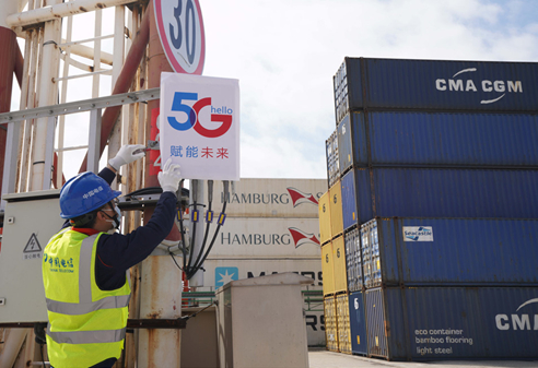 ▲中國電信工作人員正在調(diào)測碼頭5G基站