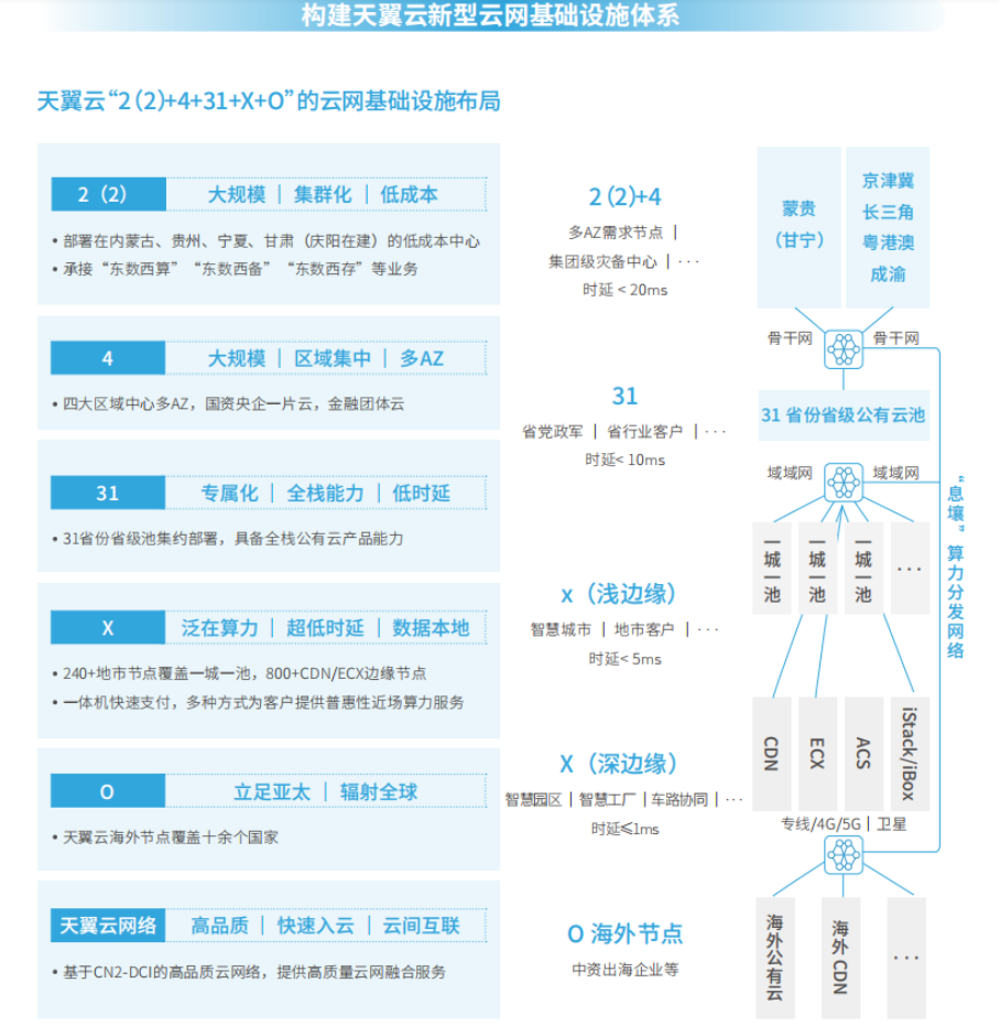 天翼云加快構(gòu)建云網(wǎng)融合的數(shù)字信息基礎(chǔ)設(shè)施,目前已形成“2(2)+4+31+X+O”資源布局。天翼云4.0可提供公