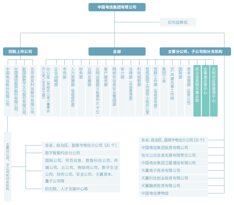 中國(guó)電信集團(tuán)有限公司在31個(gè)省(自治區(qū)、直轄市)、香港特別行政區(qū)、澳門(mén)特別行政區(qū)和美洲、歐洲等地設(shè)有運(yùn)營(yíng)機(jī)構(gòu)。集團(tuán)公司控股“中國(guó)電信股份有限公司”“中國(guó)通信服務(wù)股份有限公司”“新國(guó)脈數(shù)字文化股份有限公司”和“北京辰安科技股份有限公司”4家上市公司。