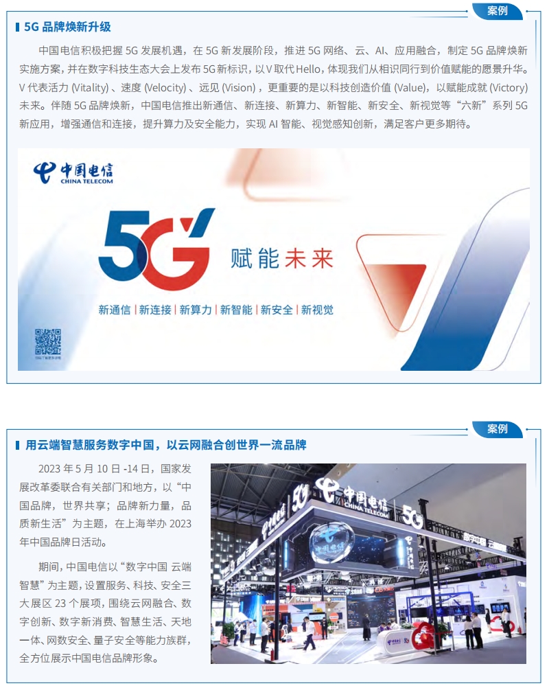 2023 年,中國電信以品牌引領(lǐng)行動為抓手,打造管理科學(xué)、價值領(lǐng)先、行業(yè)領(lǐng)軍的卓著品牌,以品質(zhì)鑄造品牌,以品牌推動發(fā)展。持續(xù)強(qiáng)化企業(yè)品牌運(yùn)營能力,不斷形成品牌競爭新優(yōu)勢,強(qiáng)化服務(wù)型、科技型、安全型的企業(yè)品牌內(nèi)涵。持續(xù)打造完善的品牌建設(shè)體系、成熟的品牌推廣能力和先進(jìn)的品牌國際化運(yùn)營模式,印發(fā)《中國電信對標(biāo)世界一流企業(yè)品牌引領(lǐng)行動實(shí)施方案》,推進(jìn)落實(shí)品牌引領(lǐng)、品牌管理、品牌影響關(guān)鍵要素和品牌國際化四大舉措。