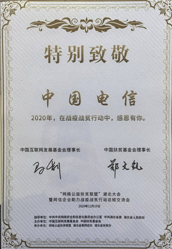 此次會議由中共中央網(wǎng)絡(luò)安全和信息化委員會辦公室、中共湖北省委、湖北省人民政府指導(dǎo),中國互聯(lián)網(wǎng)發(fā)展基金會、中國扶貧基金會主辦,網(wǎng)絡(luò)公益扶貧聯(lián)盟、湖北省委網(wǎng)信辦、湖北省扶貧辦承辦。會上,“網(wǎng)絡(luò)公益扶貧聯(lián)盟”高度認(rèn)可中國電信發(fā)揮網(wǎng)絡(luò)優(yōu)勢助力扶貧抗疫的相關(guān)行動,現(xiàn)場頒發(fā)“特別致敬”榮譽證書。